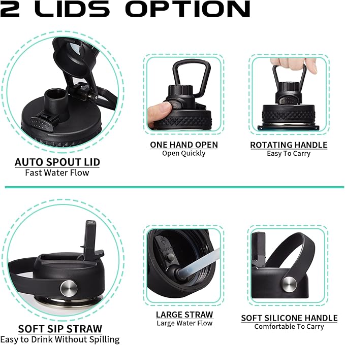 - 2 LEAKPROOF LIDS OPTIONS: The auto spout cap & straw lid provide your different drinking experience. The ONE-HAND operation pop-up spout lid for easy enjoy your fast water flow. The SPILL-PROOF straw lid with high flow rate & BPA free. Both 2 lids design with a sturdy handle, making the Hydrogen flask water bottle more convenient to carry