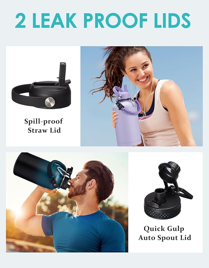 - LEAK-PROOF 2 LIDS - AUTO SPOUT LID & STRAW LID meet you different drinking need, and both lids are leak proof and with handle for carrying on the go. The pop-up spout lid features a button for one hand open quickly, and a large water outlet for fast drinking. The straw lid with straw lets you enjoy perfect spill-proof sipping to all your outdoor adventures, also can prevent the inhalation of ice cubes