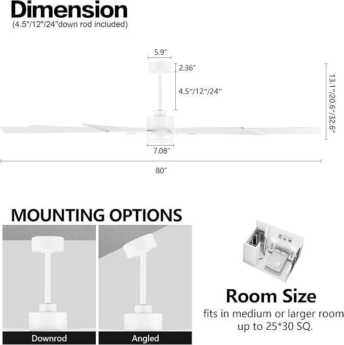 - Easy to Install: The 80" blade span makes this DC ceiling fan perfect for spaces like living rooms, bedrooms, kitchen, office or warehouse, adaptible for ceilings tilting within 15°. 3 Down rods (4.5"/12"/24"long) are included to match different ceiling heights