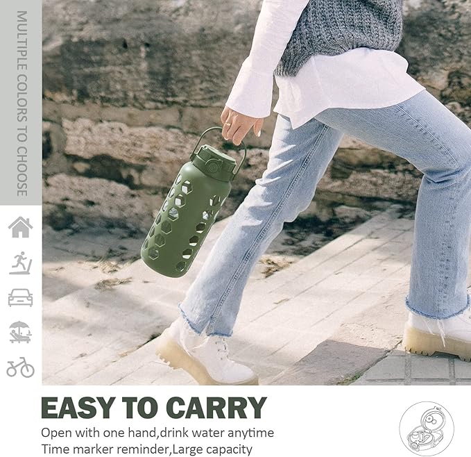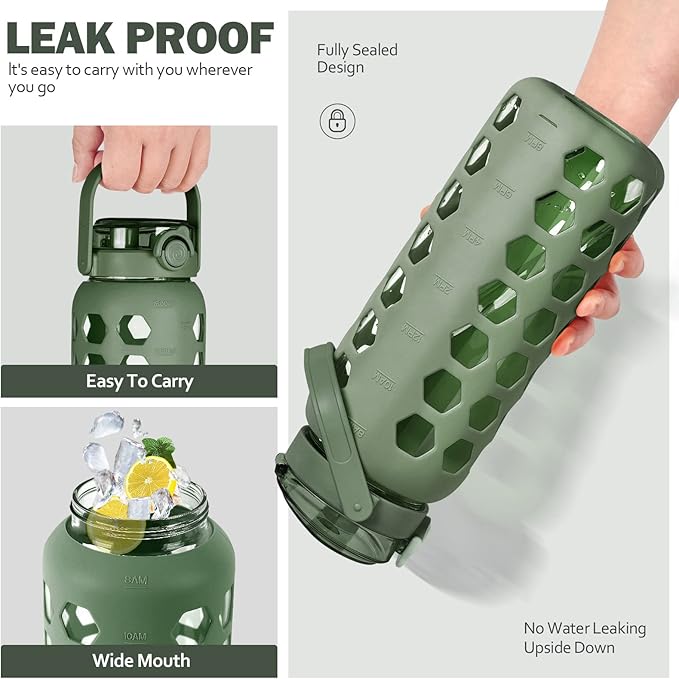 MUKOKO 56oz Glass Water Bottles with Straw and Lid,Motivational Water Jug with Time Marker Reminder and Silicone Sleeve,100% Leakproof BPA Free Fitness Sports Large Bottle-Olive