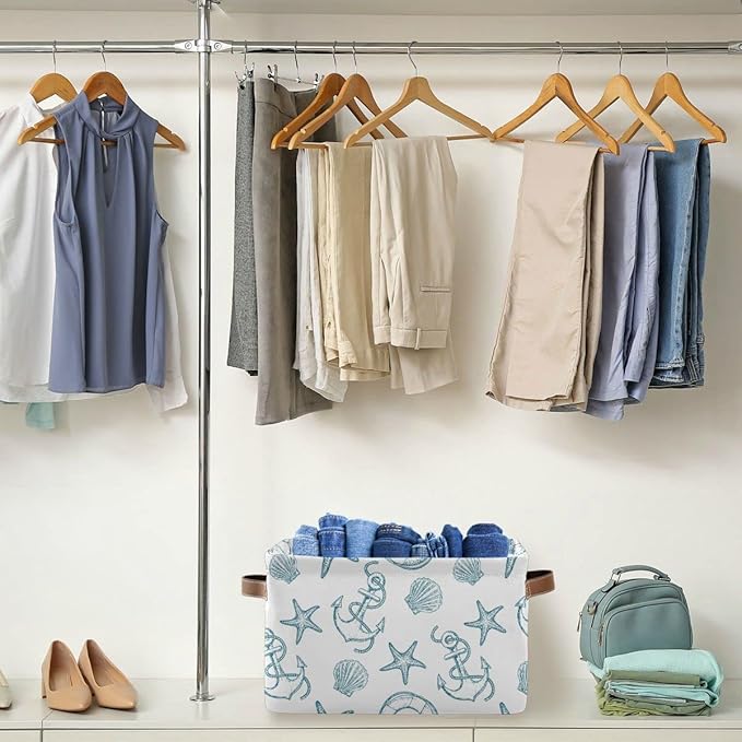 Coastal Anchor Nautical Theme Storage Basket Fabric Laundry Baskets Starfish Summer Beach Storage Boxes Organizer Bag for Baby Cloth Dog Toy Book Storage Cubes Shelf Closet Bins 16x12x8 Inches