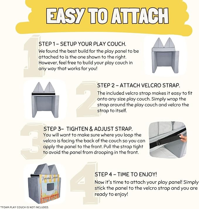 - MADE FOR EVERYONE - No couch? No problem! Our adjustable straps allow you to connect the play panels to any normal couch cushion or chair! **Play couch not included with purchase**
