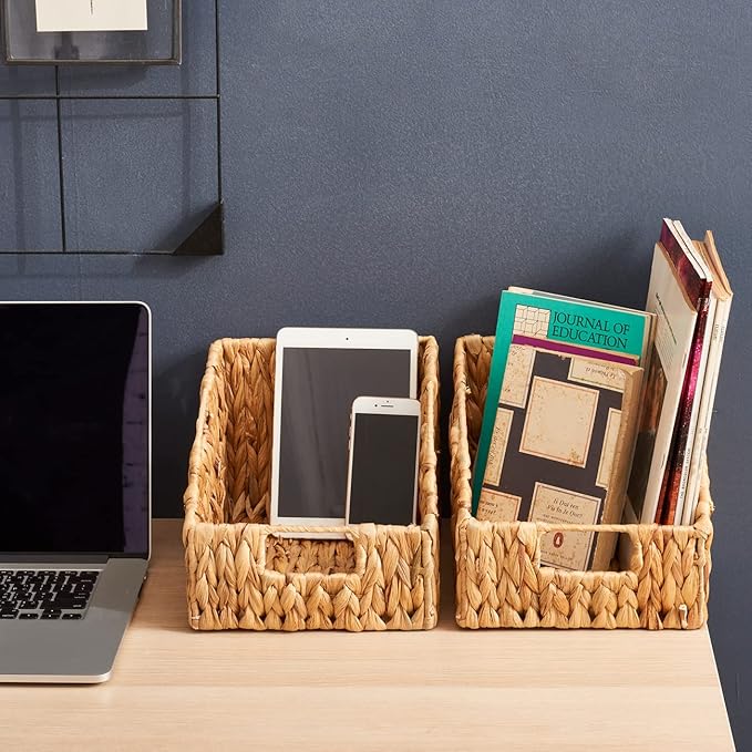 - STURDY & DECORATIVE - Beautifully hand-woven out of all natural water hyacinth with a durable metal frame into rectangular baskets. The earthy tones in the natural fibers offer an attractive and visually aesthetic room decor accent. A practical way to maximize storage in any room of your home or office.