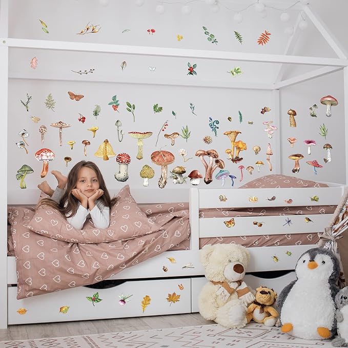 - Beautiful Watercolor Design: our mushroom wall stickers are printed with various mushrooms and other natural creatures, such as green leaves, branches, hazelnuts, butterflies, berries, lovely animals and so on, eye catching and diverse, bring your home a feeling of nature