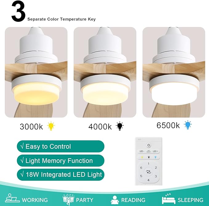 - High performance large ceiling fan: With 3 wood blades and powerful dc motor, the wood ceiling fan offers a morden and elegant style and more pweroful wind than other ceiling fan. Ideal for bedroom, living room, dining room, garage, barn, or covered patio. It is also perfect for indoor and outdoor decoration design, not just for home, but also for commercial using: classroom, meeting room, restaurant and more.