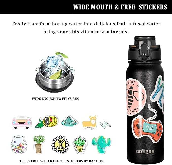 GOPPUS 20oz Insulated Stainless Steel Water Bottle with Straw Lid Reusable Leakproof Water Flask, Keeps Hot and Cold Sports Canteen Water Bottles for Kids Men Women Gym οΌBlack 1 LidοΌ