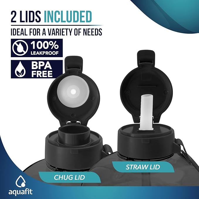 - 2-in-1 Chug & Straw Lid - Our 1 gallon water jug comes with a dual functionality lid that allows you to chug or sip without having to change the lid. The smart, off-centre placement of the lid lets you use both the spouts with ease - sip while you work and chug after a rigorous workout!