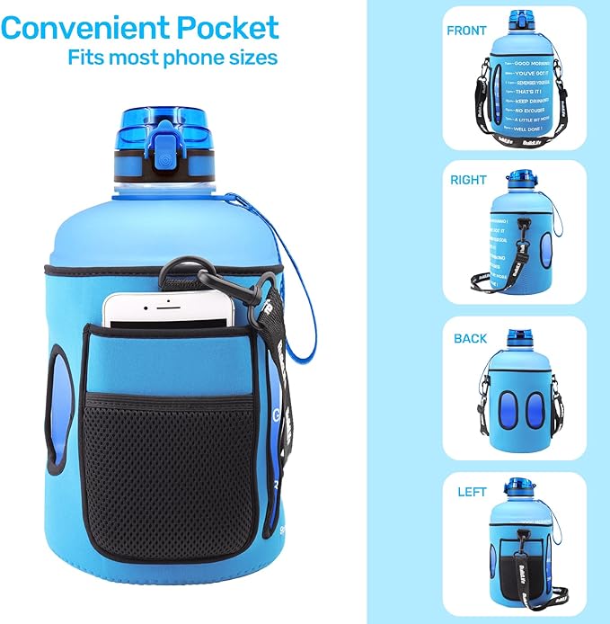 - 【LOCK & ONE BUTTON】QuiFit 1-Button design 1 gallon water jug gives quick easy access to fresh water and saves time and effort. The giant water jug’s opening is sized to fit ice cubes and fruit, the strong nylon strap easy to carry.