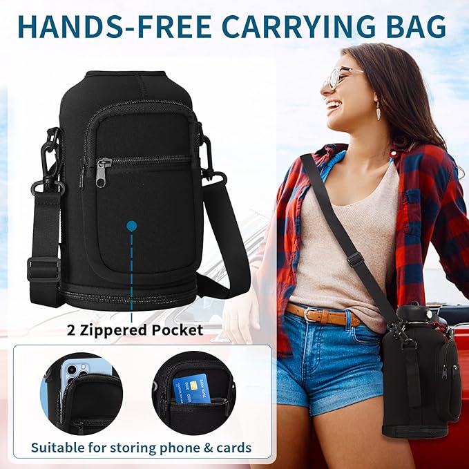- HANDS-FREE BOTTLE CARRIER BAG & PROTECTIVE BOOT - Stainless steel water bottles with shoulder strap carrier have 2 zipper storage pockets hold your phone, cards, keys. The carrying pouch also provide extra insulation, with the silicone cup mat full-protect the reusable water bottle from additional damage and extend the life of thermo hydro mug