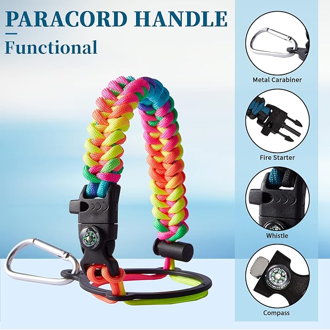 - PERSONALIZATION BOTTLE PARACORD HANDLE - Thermo water bottle with a pretty cool functional paracord handle which does more than meets the eye. The survival strap cord made of military grade nylon, with compass, safety loop, metal carabiner, flint, igniter and whistle. Can help you out if you were in a survival situation while hiking, camping or everyday life