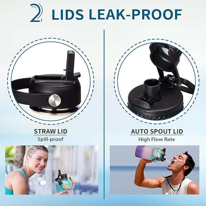 - LEAK-PROOF 2 LIDS - AUTO SPOUT LID & STRAW LID meet you different drinking need, and both lids are leak proof and with handle for carrying on the go. The pop-up spout lid features a button for one hand open quickly, and a large water outlet for fast drinking. The straw lid with straw lets you enjoy perfect spill-proof sipping to all your outdoor adventures, also can prevent the inhalation of ice cubes