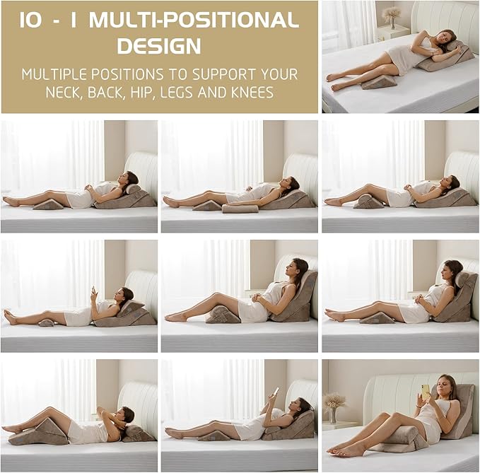 Qirroboni 4PCS Orthopedic Bed Wedge Pillow Set, Adjustable Pillows for Neck, Back and Leg Pain Relief Comfortable & Post Surgery Foam - Heartburn, Anti Snoring, Acid Reflux & GERD Sleeping Brown