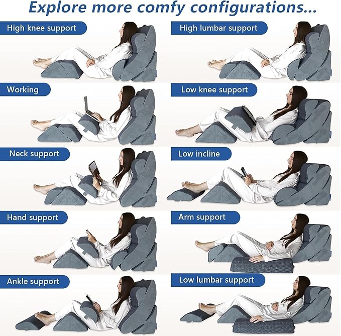 - 【Soft & Supportive Gel Memory Foam】The back pillow, lumbar pillow and the head pillow of the wedge pillow set are made of soft memory foam with gel particles, which ensures comfortable and refreshed even with prolonged use. The base pillow, leg pillow and knee pillow are made of high-density foam, which provides sufficient support and will not deform after long-term use.