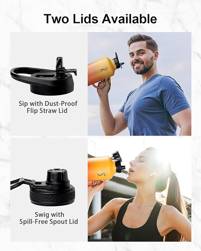 - No Spills, No Worries: Our stainless steel water bottle comes with a dust-proof flip straw lid and a spill-free spout lid, meeting your different needs. With accurate silicone seal rings, they are both 100% leak-proof and spill-proof.
