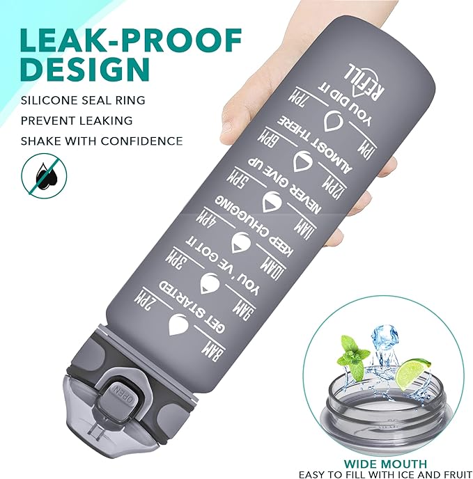 - 【Motivational Quote & Time Marker】32 oz water bottle with unique inspiration quote and time marker, reminding you to stay hydrated. The capacity marker helps you tracking daily water intake. A silicone straw makes you enjoy spill-proof sipping without effort. A necessary have for people of different occupations such as athletes and white-collar workers.
