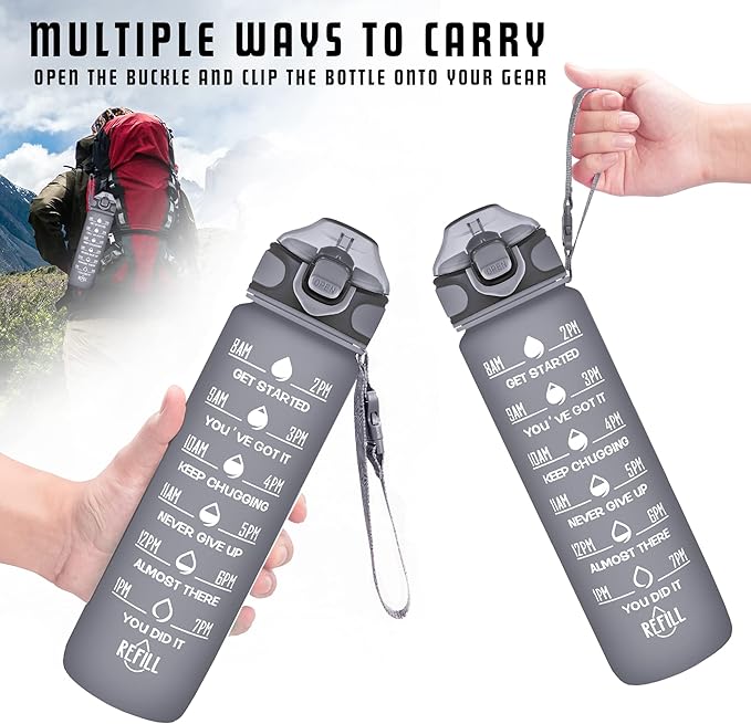 - 【Buckle Handle Design】Our water bottle with carrying strap and release buckle, you can choose hands-free or handle type, convenient for you to connect 32 oz water bottle to your backpack, bike, or travel bag. Featuring a wide mouth opening, easy to clean and add ice. Ideal for travel, hiking, gym, and any indoor & outdoor activities.