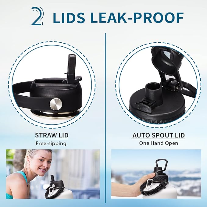 - LEAK-PROOF 2 LIDS - AUTO SPOUT LID & STRAW LID let you can enjoy spill-proof sipping and fast drinking to meet your different drinking needs. The pop-up spout lid is designed for one-hand open and close, with a large water outlet for fast drinking. The straw lid lets you sip on the go, with perfect spill-proof sipping to all your outdoor adventures, and it can also prevent the inhalation of ice cubes