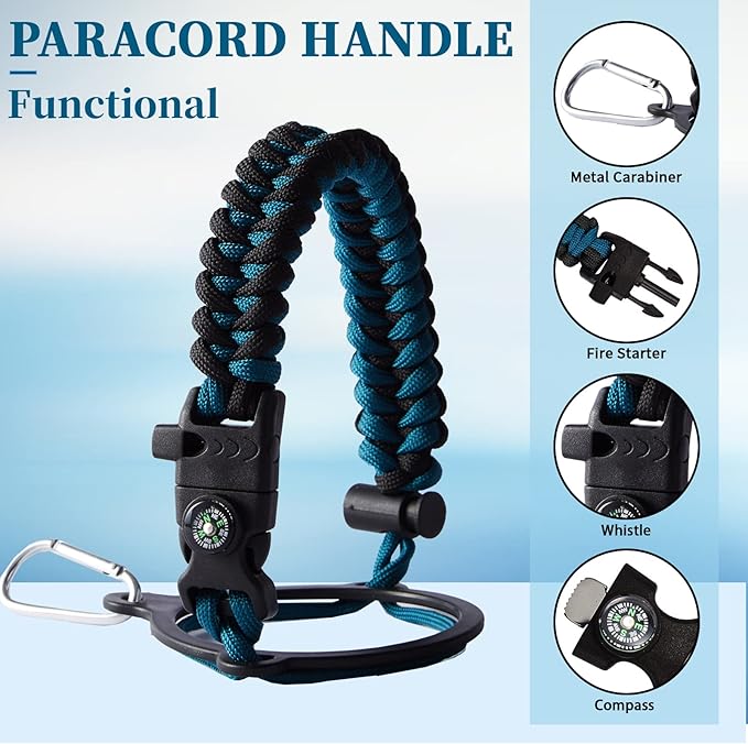 - PERSONALIZATION BOTTLE PARACORD HANDLE - 128oz Insulated water bottle with a pretty cool functional paracord handle which does more than meets the eye.?The survival strap cord is made of military-grade nylon and comes with a compass, safety loop, metal carabiner, flint, igniter, and whistle, making it a functional and stylish addition to your water flask, is perfect for outdoor camping, hiking, fitness enthusiasts