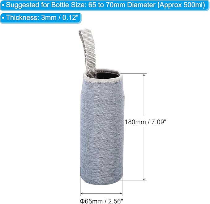 - Color: Gray; Material: Neoprene; Overall Size: 65mmx180mm / 2.56"x7.09"; Suggested for Bottle Size: 65 to 70mm Diameter(Approx 500ml); Thickness: 3mm / 0.12 inch; Packing List: 4 x Water Bottle Sleeve