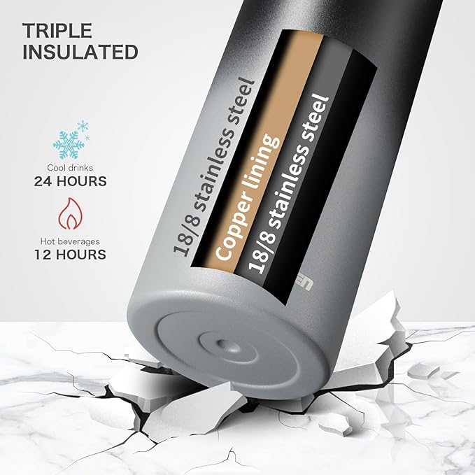 - TRIPLE INSULATION: Stainless steel water bottles with Triple-insulation technology,2 stainless steel walls enclosing an inner copper, this keeps the insulated water bottle 32 oz Cold up to 24+ hours and Hot up to 12 hours, which also can reduce the condensation effectively. Insulated water bottles ensures you have a cool drink after exercise in summer or enjoy warm coffee outdoor in winter.