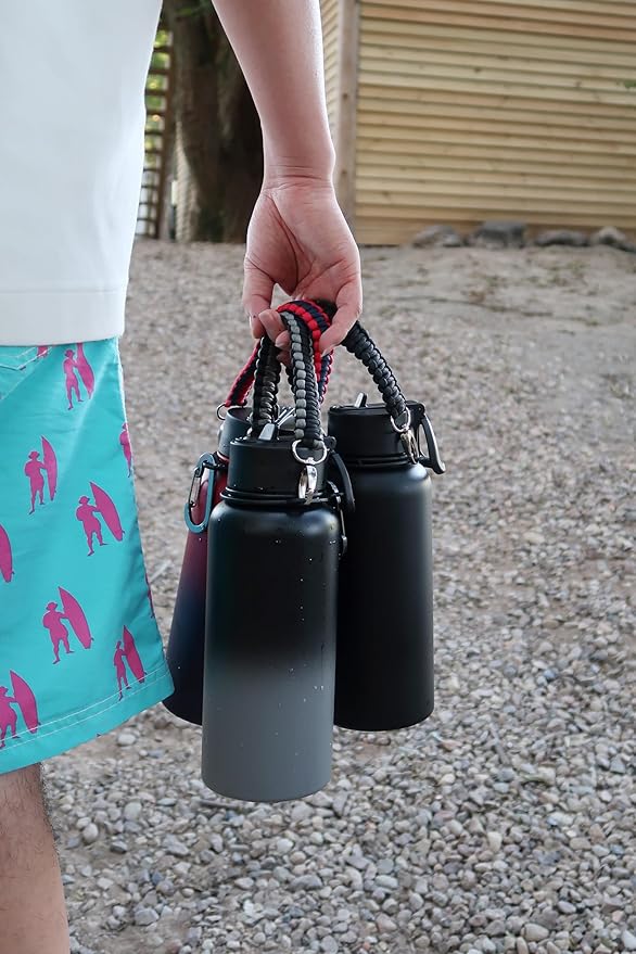- Paracord Handles & Strap:32 oz water bottles Equipped with high quality colorful nylon braided Paracord Handles, bid farewell to the uncomfortable grip feeling, make the lifting more relaxed! Insulated 32 oz water bottle also comes with a 70.86 inches retractable strap, which can be worn directly on the body to free your hands and allow you to ride, climb, hike, rock climb and surf freely.