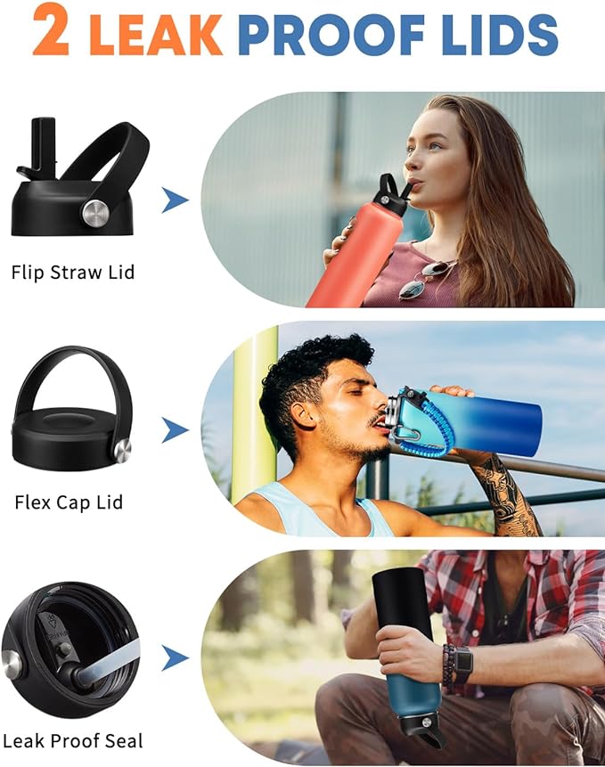 - LEAK-PROOF 2 LIDS OPTION: The stainless steel water bottle 40oz metal flask water bottles is equipped with two individual lids to keep beverages fresh and intact all day without transfer of flavor. The wide mouth flex lid for easy drinking and strong tightness for no leaks when you're on the go. The hands-free straw lid for spill-proof sipping and the package comes with an alternative straw & a straw brush for easy cleaning