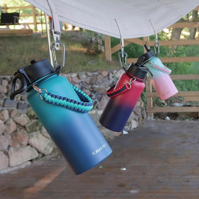 - Paracord Handles & Strap:32 oz water bottles Equipped with high quality colorful nylon braided Paracord Handles, bid farewell to the uncomfortable grip feeling, make the lifting more relaxed! Insulated 32 oz water bottle also comes with a 70.86 inches retractable strap, which can be worn directly on the body to free your hands and allow you to ride, climb, hike, rock climb and surf freely.