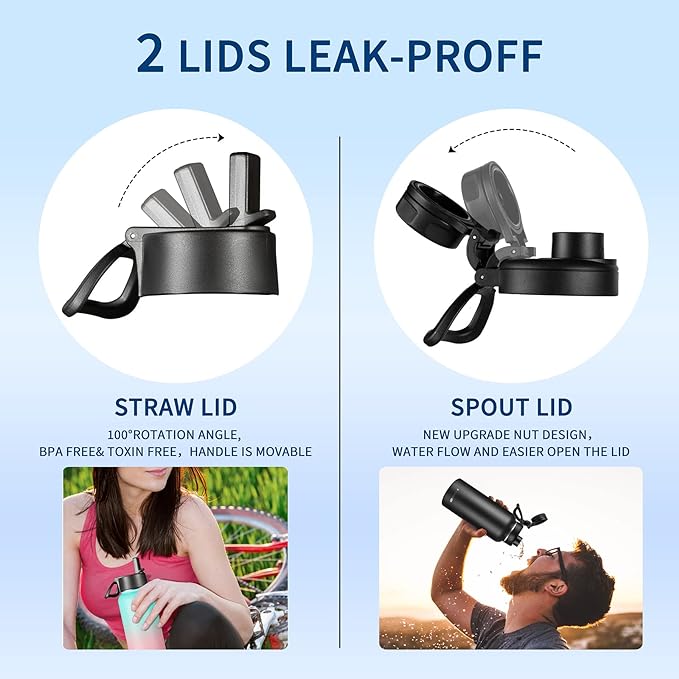 - 2 LEAKPROOF LIDS: Insulated water bottle with straw is equipped with 2 lids-Straw Lid& Spout Lid, both of which are sealed and leak-proof,Straw lid is right for cold beverages. Spout Lid is suitable for room temperature or hot drinks, It has two-stage force design to ensure that the lid won't fall off and knock your nose when you open it while drinking.