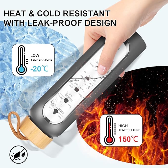 - [Your Ultimate Hydration Partner]: Our clear glass drinking bottle are made of borosilicate glass, which is dishwasher safe, leak proof, BPA, BPS, PVC, lead, and cadmium free. These durable and aesthetic reusable glass time water bottles will not crack under extreme temperature and pressure.