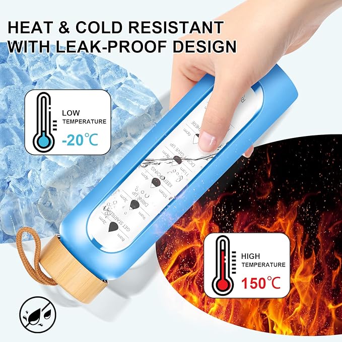 - [Your Ultimate Hydration Partner]: Our clear glass drinking bottle are made of borosilicate glass, which is dishwasher safe, leak proof, BPA, BPS, PVC, lead, and cadmium free. These durable and aesthetic reusable glass time water bottles will not crack under extreme temperature and pressure.