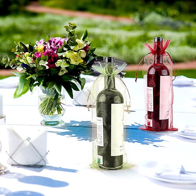 - Package includes: 10 x gold mesh wine bags, 10 x red wine bottle gift bags, 10 x olive green organza wine bags, 10 x black sheer organza wine bottle bags with drawstring.