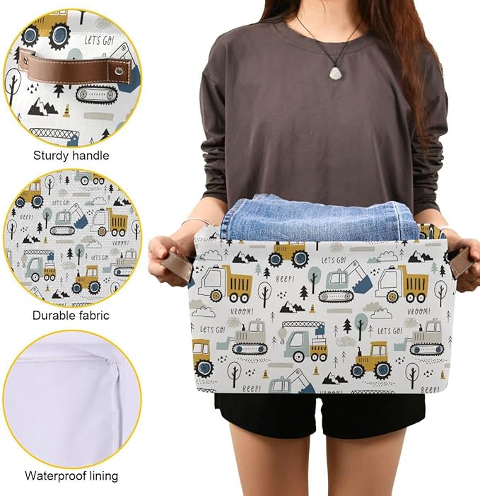 Excavator Truck Toy Storage Basket Fabric Kitchen Baskets Cars Boys Toys Open Home Storage Bins Boxes Foldable Organizer Bag for Baby Cloth Book Shelf Closet Baskets 16×12×8 Inches