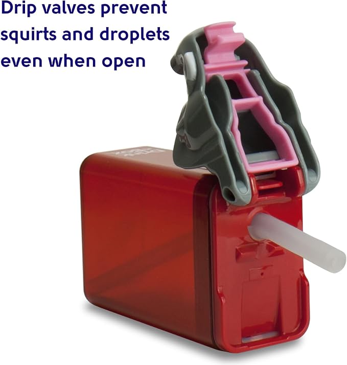- New "heart-valve" in spout prevents drips when Drink in the Box is tipped over. Safer and better seal and locking lid prevents messy spills. Replaceable silicone straw and seal. Three year guarantee.