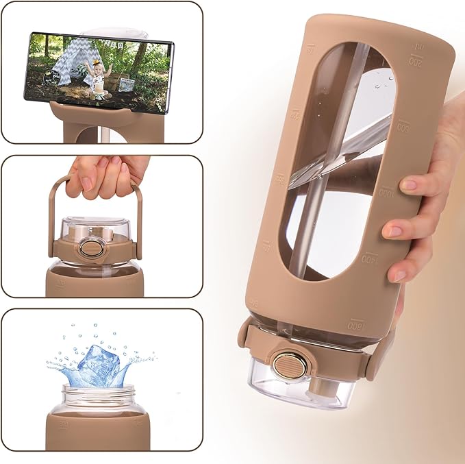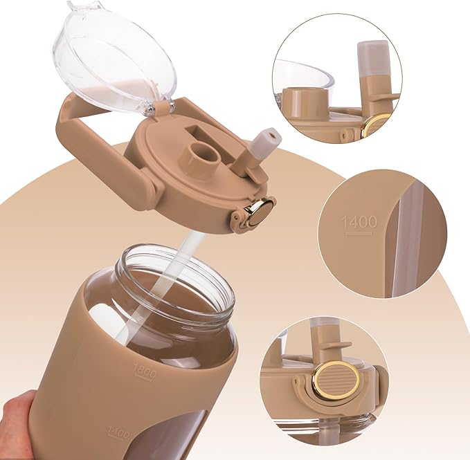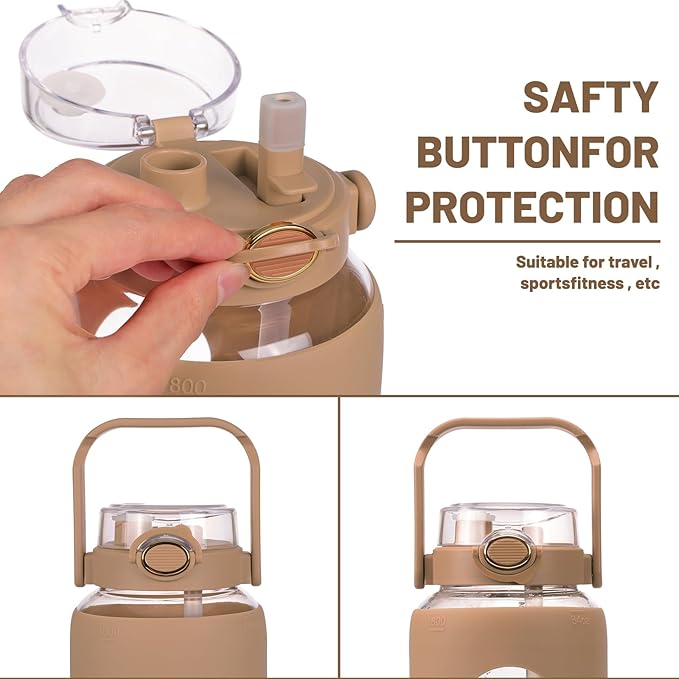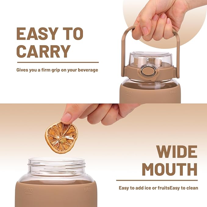 - Glass Water Bottle with Straw: The portable glass bottle with a silicone sleeve also includes 1 sponge brush and 1 Straw brush. The 64oz water bottle with straw has an upgraded dust-proof cover design, a pop-up cover with a silicone O-ring, and a one-touch button that allows you to drink directly or through a straw.