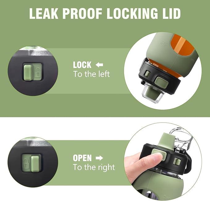- LOCKING LID & CARRY LOOP - The locking lid ensures no spills while on the go and prevents accidental leakage even the water bottle tip over or be laid on its side. The lid flips open at the push of a button. The carry loop is made from a durable and flexible material that can withstand the weight of the filled bottle and the stress of carrying. Leak-proof lid, soft silicone straw mouth piece and travel friendly soft grip hand.