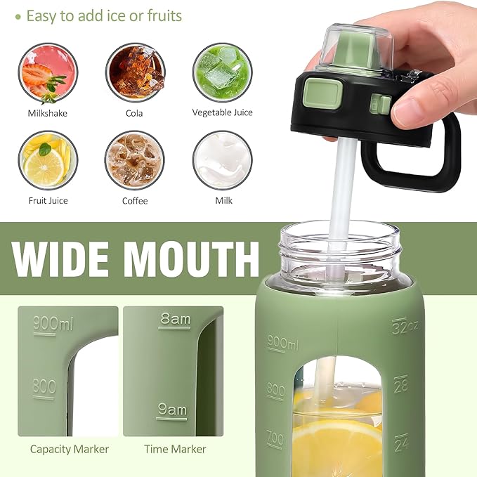 - WINDOWS AND TIME MARKER ON SILICONE SLEEVE - The durable silicone sleeve can provide protection and comfortable grip to protect your glass bottles when in use. The capacity and time markers on silicone sleeve serve as a visual guide, encouraging you to drink water at regular intervals. you can ensure that you stay adequately hydrated and maintain a healthy drinking routine. The windows on the sleeve allow you to see the liquid level inside the bottles.