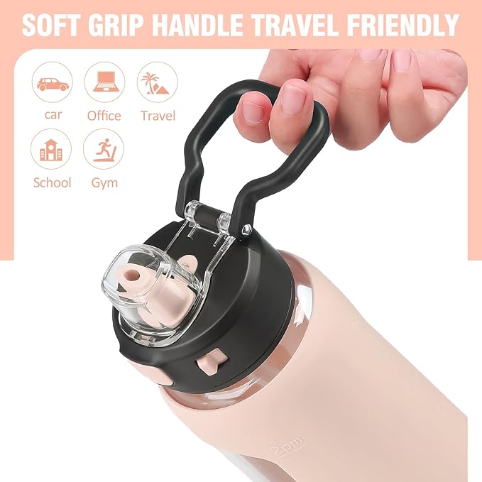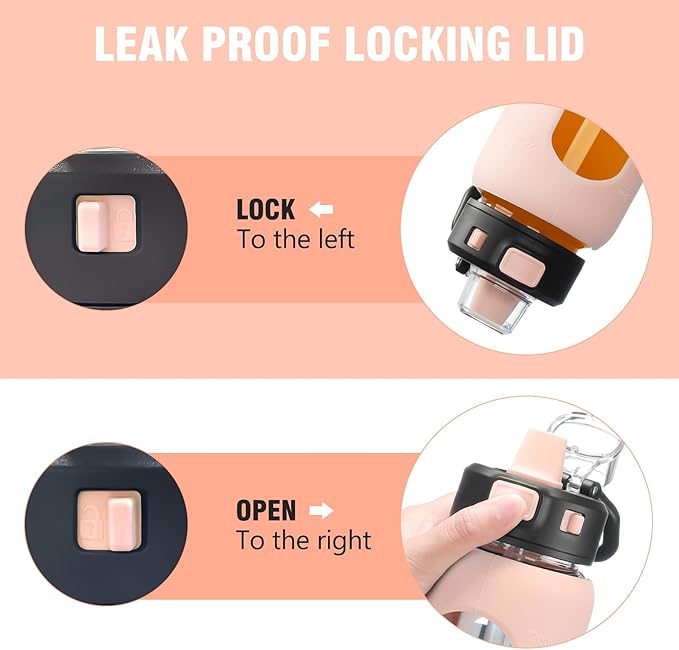 - LOCKING LID & CARRY LOOP - The locking lid ensures no spills while on the go and prevents accidental leakage even the water bottle tip over or be laid on its side. The lid flips open at the push of a button. The carry loop is made from a durable and flexible material that can withstand the weight of the filled bottle and the stress of carrying. Leak-proof lid, soft silicone straw mouth piece and travel friendly soft grip hand.
