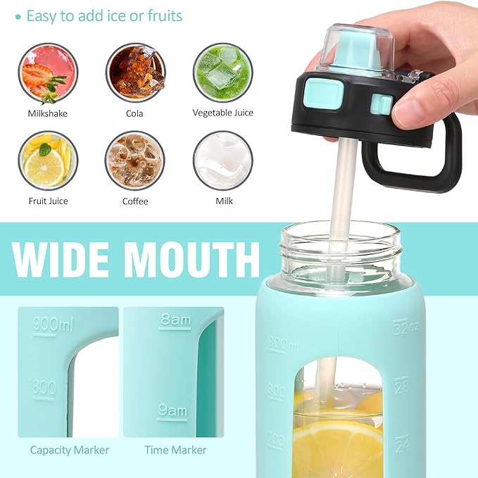 - WINDOWS AND TIME MARKER ON SILICONE SLEEVE - The durable silicone sleeve can provide protection and comfortable grip to protect your glass bottles when in use. The capacity and time markers on silicone sleeve serve as a visual guide, encouraging you to drink water at regular intervals. you can ensure that you stay adequately hydrated and maintain a healthy drinking routine. The windows on the sleeve allow you to see the liquid level inside the bottles.