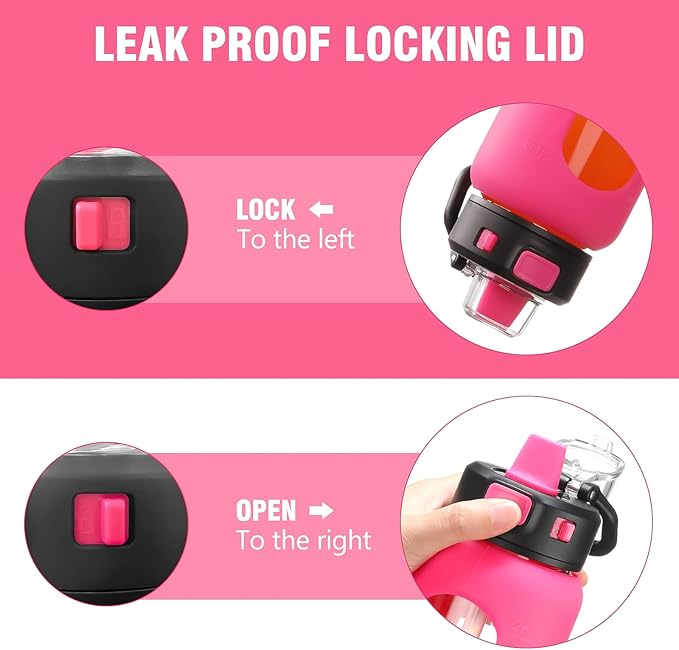 - LOCKING LID & CARRY LOOP - The locking lid ensures no spills while on the go and prevents accidental leakage even the water bottle tip over or be laid on its side. The lid flips open at the push of a button. The carry loop is made from a durable and flexible material that can withstand the weight of the filled bottle and the stress of carrying. Leak-proof lid, soft silicone straw mouth piece and travel friendly soft grip hand.