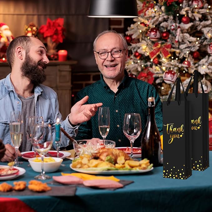 - Theme : Elegant and Meticulous Design: our wine bottle bags for gifts are designed with a classic background color, simple and generous, metal gold foil [Thank you] increases the sense of luxury, it is easy to attract the attention of others; It is a nice interpretation of your thank you gift wine bag, family and friend who receive the gift will praise your aesthetic Elegant and Meticulous Design: our wine bottle bags for gifts are designed with a classic background color, simple and generous, metal gold foil [Thank you] increases the se… See more