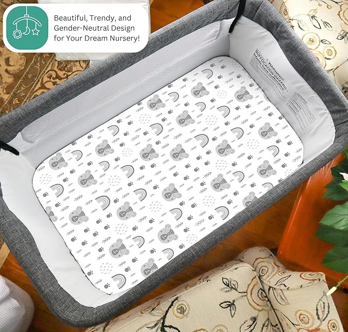 TansyPanda Bassinet Sheets for Angelbliss, Koolerthings, and Koola Baby Bassinet Bedside Sleeper, 3 Pack, 33x20 inch, Ultra Soft, Breathable, Snug Fit, Unisex Boys Girls, Gray White (Woodland Rainbow)