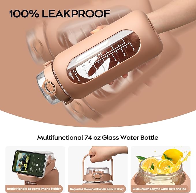 - 【Multifunctional Humanized Design】The 74 oz(2.2L) glass water bottle featured with latest pop up lid with premium O-ring safety lock, 100% leak-proof, and can be easily opened with one hand.The large glass bottles have two ways to drink water by a silicone straw and a hole that can be drink from directly , which is very convenient and fast.