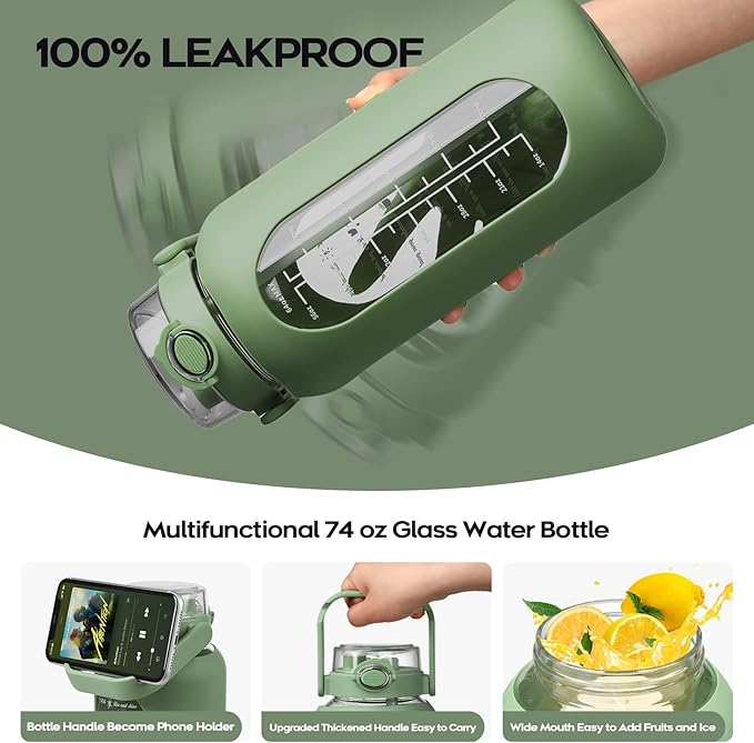 - 【Multifunctional Humanized Design】The 74 oz(2.2L) glass water bottle featured with latest pop up lid with premium O-ring safety lock, 100% leak-proof, and can be easily opened with one hand.The large glass bottles have two ways to drink water by a silicone straw and a hole that can be drink from directly , which is very convenient and fast.