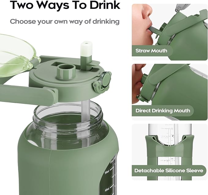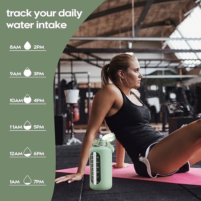 - 【Feature Details】The half gallon(2.2L) water bottle with straw has an anti-slip and high quality silicone sleeve to protect the glass water bottle and help prevent it from being slippery in your hands or slight bumps, it keeps standup stably.In order to make the big gym motivational water bottle easy to carry we have equipped it with handle.