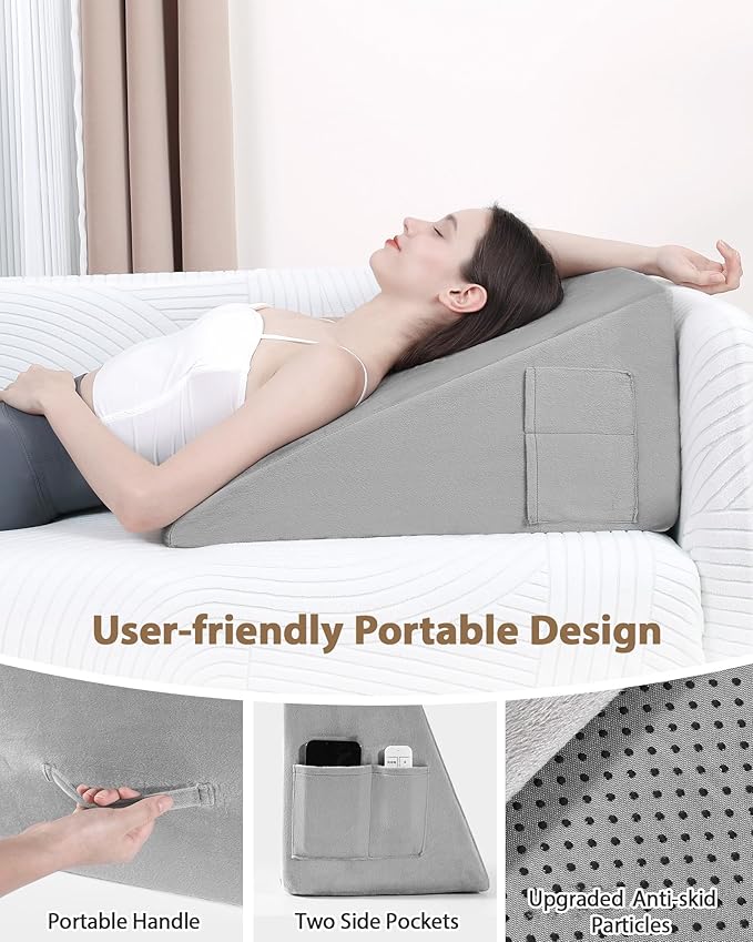 - Convenient Storage Pocket: This pillow wedge has two side pockets with different orientations that can store your phone, glasses, and remote control. The non-slip fabric at the bottom ensures the pillow stays in place for a peaceful sleep.