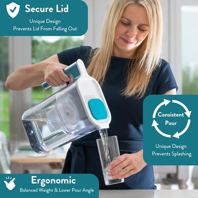 Perfect Pour Large 10 Cup Water Filter Pitcher by Aqua Optima, Reduces Microplastics, Ergonomic, Eliminates Splashes and Spills, BPA Free, NSF Certified, Includes 6 Evolve+ Water Filters, Blue