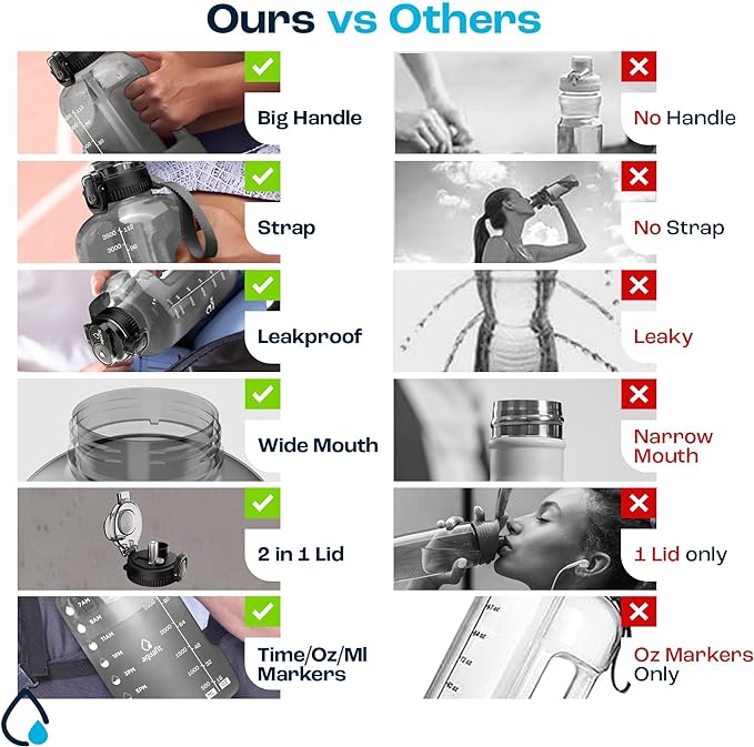 - Track How Much You Drink - Our BPA Free one gallon water bottles come with time markers on the side so you can see your daily water intake and stay on track meet your health and fitness goals.