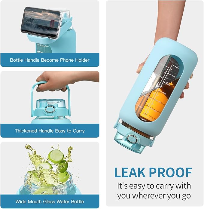 - Glass Water Bottles With Time Marker : The motivational glass water bottles with straw holds 42-64 oz water that is equivalent to 8 cups of water that suggest by scientists for human drink per day, allows you not to refill it frequently anymore. With unique inspiration quotes & time marker & capacity scale, the 64 oz water bottle with carry handle is great for measuring your daily intake of water, helps you stay hydrated and drink enough all day