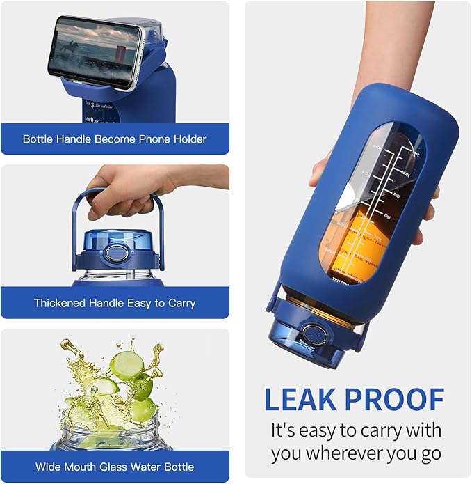 - Glass Water Bottles With Time Marker : The motivational glass water bottles with straw holds 42-64 oz water that is equivalent to 8 cups of water that suggest by scientists for human drink per day, allows you not to refill it frequently anymore. With unique inspiration quotes & time marker & capacity scale, the 64 oz water bottle with carry handle is great for measuring your daily intake of water, helps you stay hydrated and drink enough all day