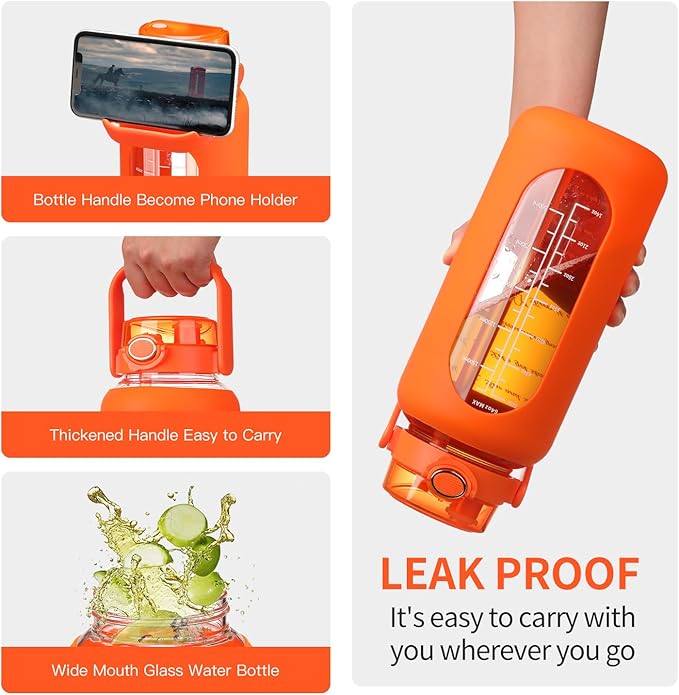 - Glass Water Bottles With Time Marker : The motivational glass water bottles with straw holds 42-64 oz water that is equivalent to 8 cups of water that suggest by scientists for human drink per day, allows you not to refill it frequently anymore. With unique inspiration quotes & time marker & capacity scale, the 64 oz water bottle with carry handle is great for measuring your daily intake of water, helps you stay hydrated and drink enough all day